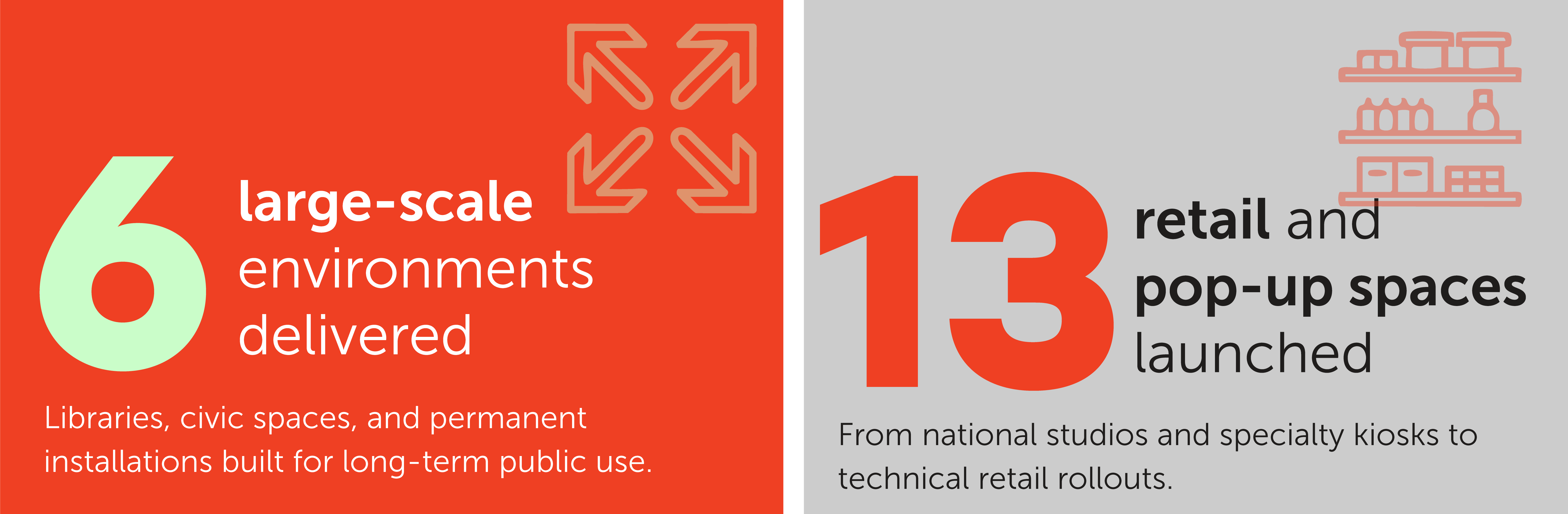 This year wasn’t defined by one signature project. It was defined by range. Libraries, retail spaces, sculptural icons, traveling brand vehicles, pop-ups, characters, installations, prototypes, and environments that asked us to problem-solve in new ways. We collaborated, experimented, engineered, refined, and delivered, fast. And we had a lot of fun doing it.