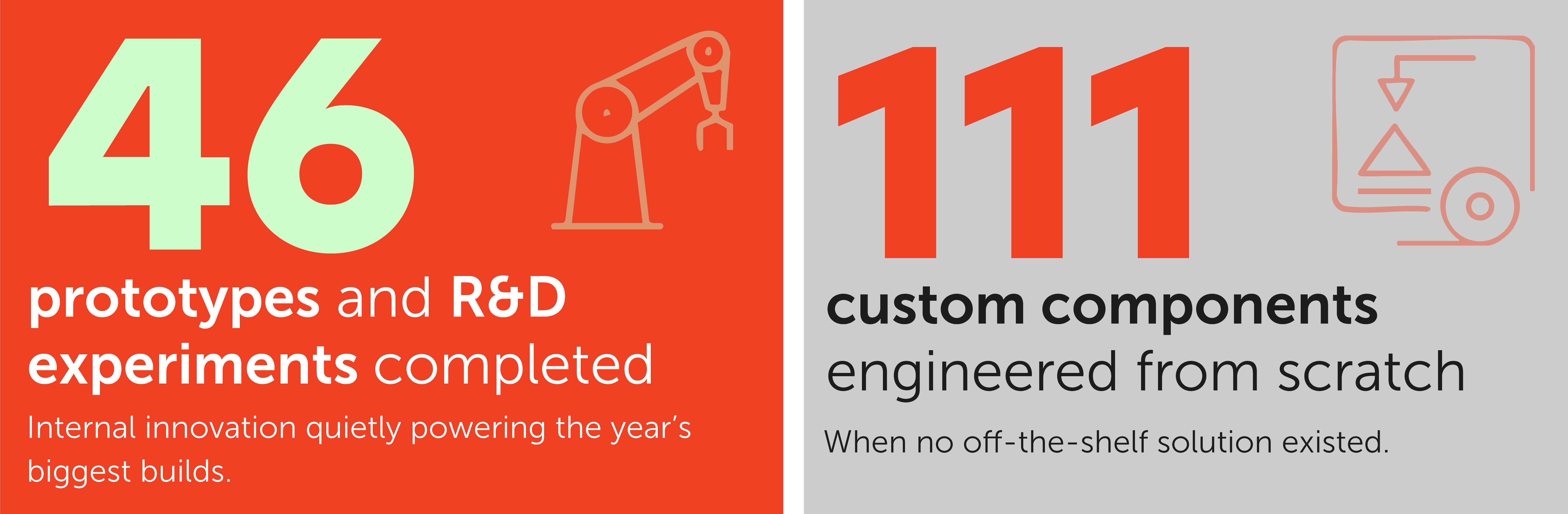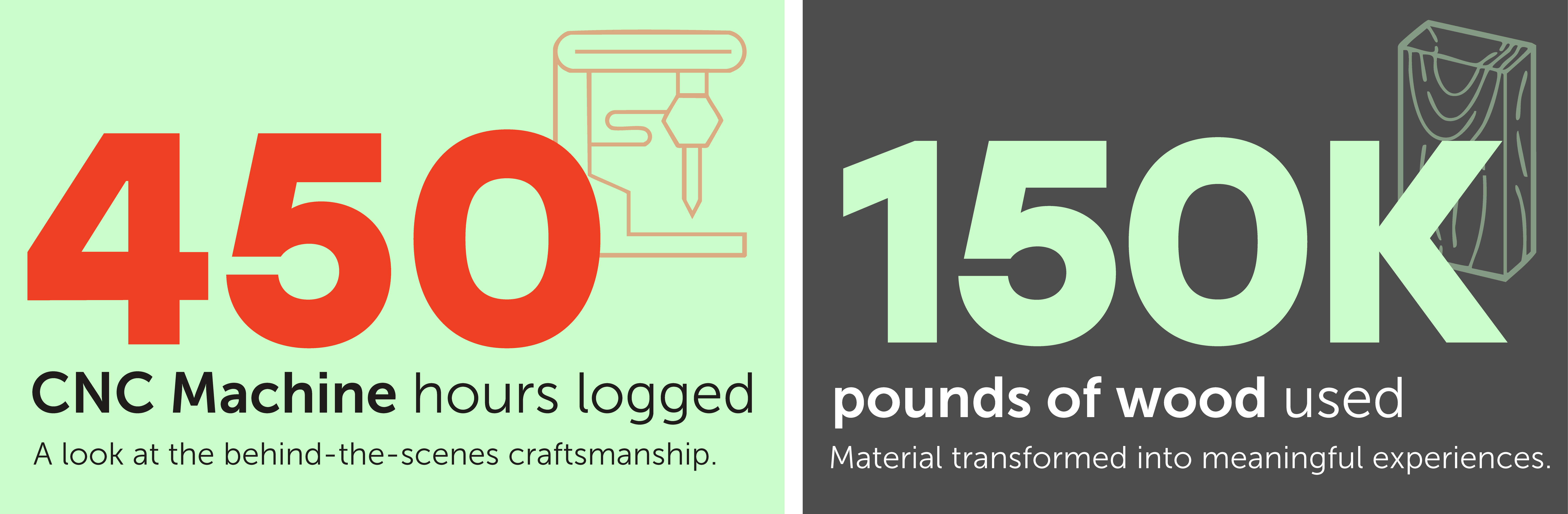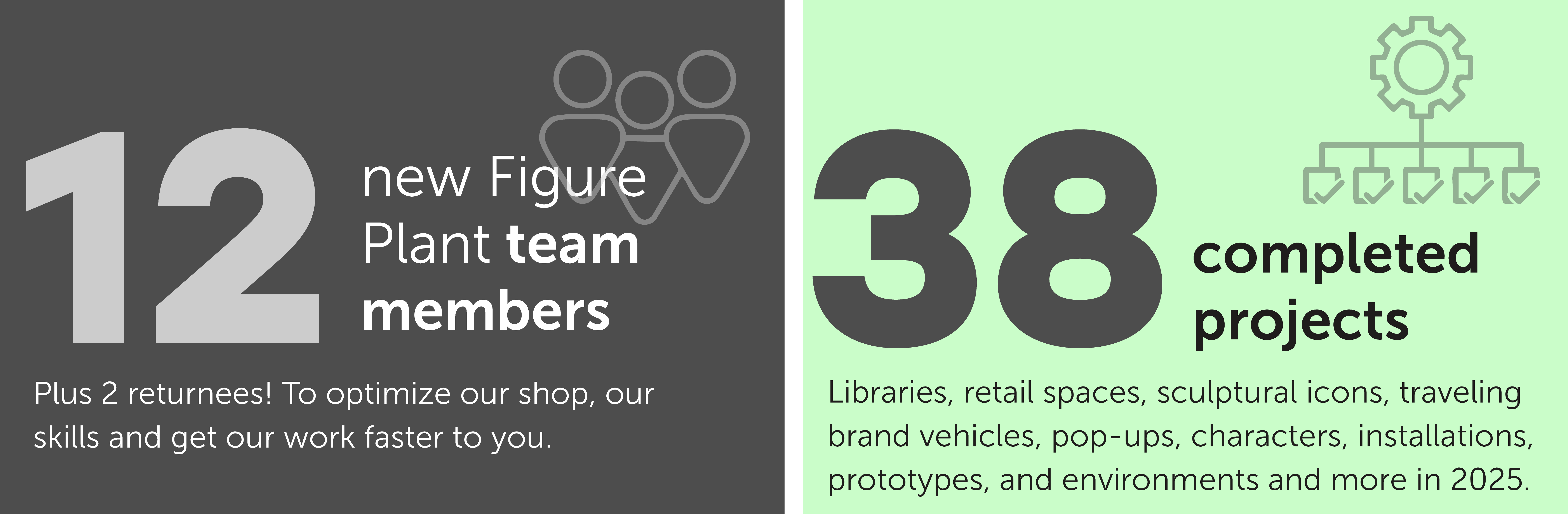 Now that we've explored the projects that shaped our year, here’s a quick snapshot of the scale, craft, and creative momentum that moved through the shop in 2025. These numbers tell the story of a team that showed up, leaned in, and built work that traveled across the country and into the hands, paths, and experiences of thousands of people. A year of big ideas, tight timelines, problem solving, and the kind of behind-the-scenes magic that makes fabrication worth doing. Behind every number was a moment of creative problem-solving, learning something new, or strengthening a relationship with a partner.